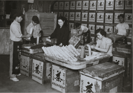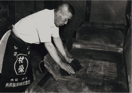 大阪淀屋橋にて、松本軒茶舗創業。 「共栄」の前掛けをして手揉み(板ずり)している様子 宇治支店 (現宇治久保工場・現TEA SQUARE MORIHAN)