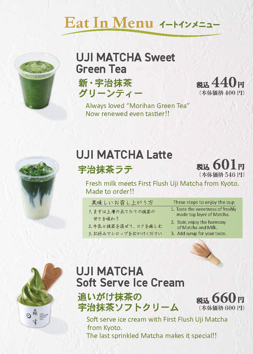 リニューアルした森半のグリーンティー、 点てたてのお抹茶を使った抹茶ラテ、 抹茶ソフトに追い抹茶をかけたソフトクリームなどを