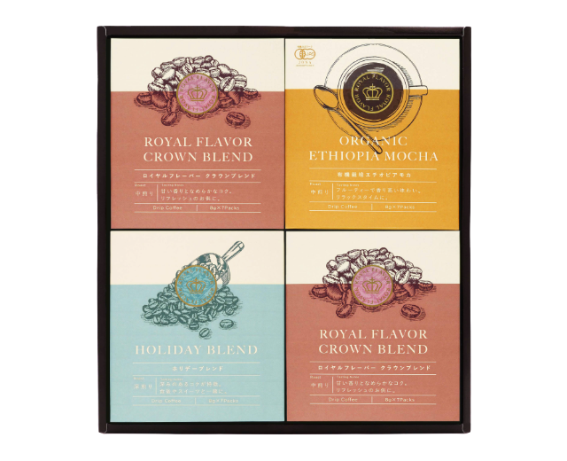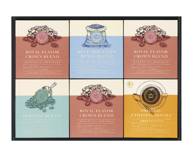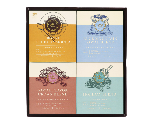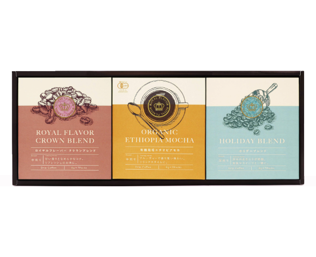強い酸味や濃厚なコクが特徴のキリマンジャロブレンドとモカブレンドとロイヤルブレンドの詰合わせ。