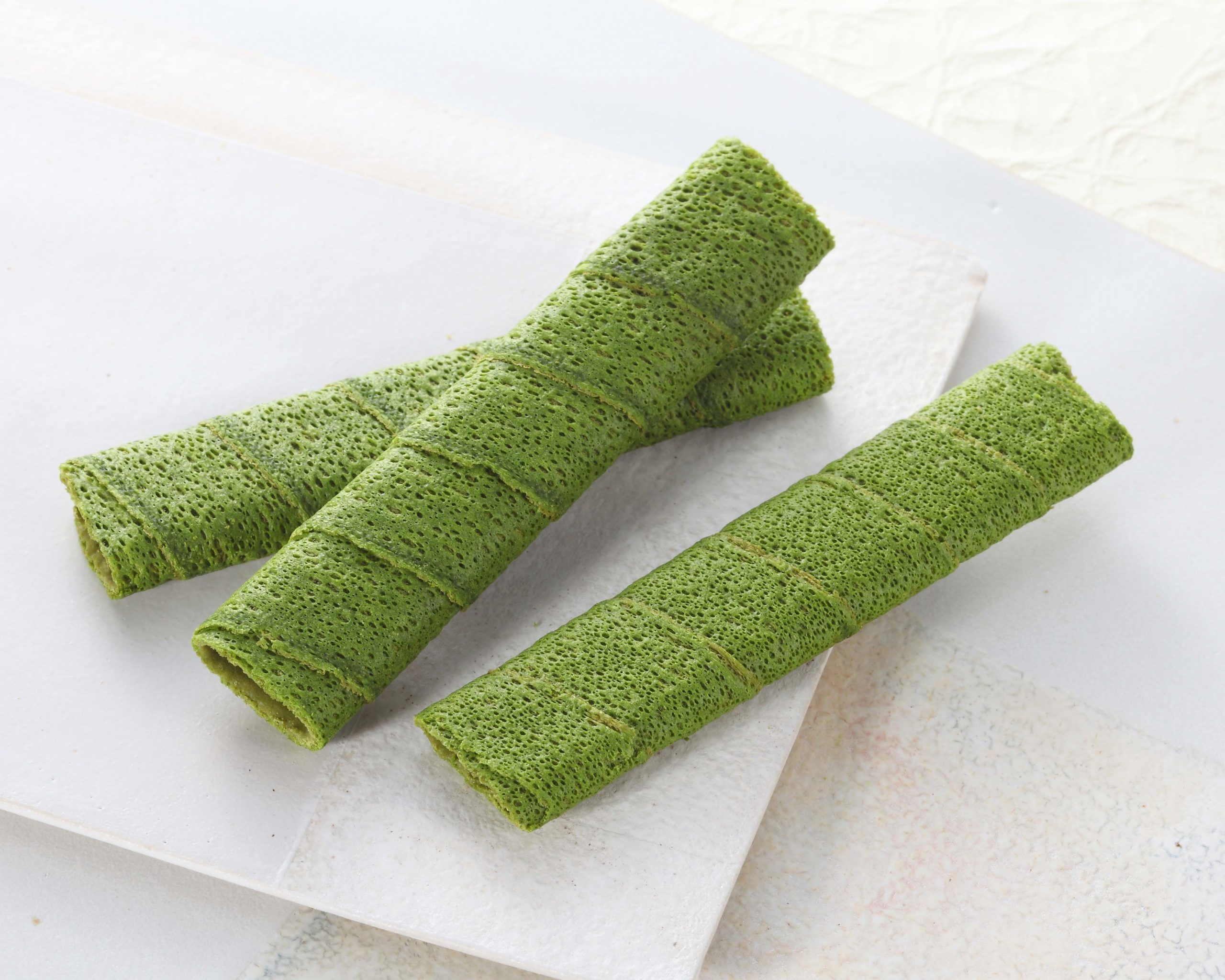 薄焼きクレープをまるめて、内側に抹茶チョコレートを流し込みました。